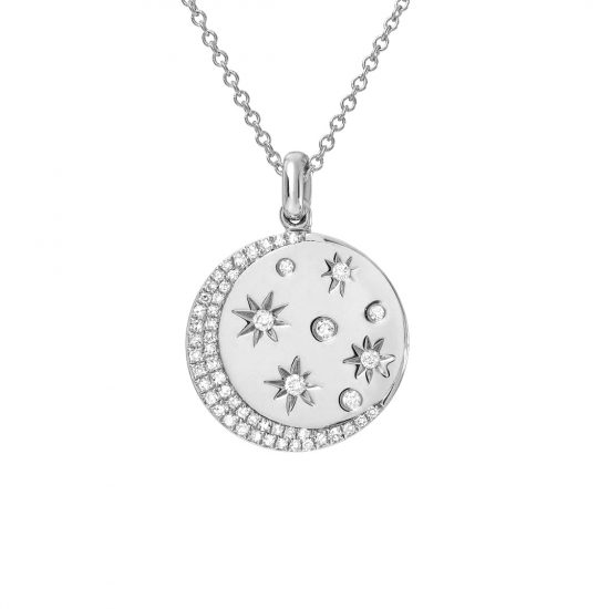 La medalla de este lindo collar entrelaza una luna creciente brillante para nuevos comienzos y un sin fin de estrellas para iluminar tu camino y así potenciar tus sueños con estos elementos celestiales.
