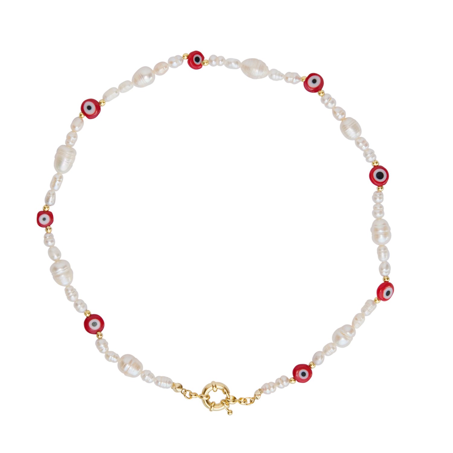 Collar hecho de perlas de agua dulce, cuentas Nazar Rojas y pelotitas bañadas en oro de 18k.