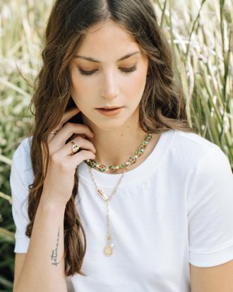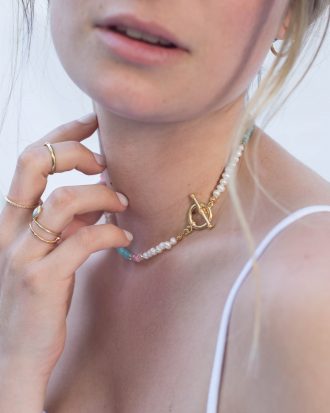 Collar de cuentas de ágatas verdeagua y rosadas, perlas naturales y mostacillas bañadas en oro, broche marinero bañado en oro;