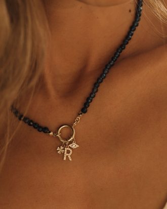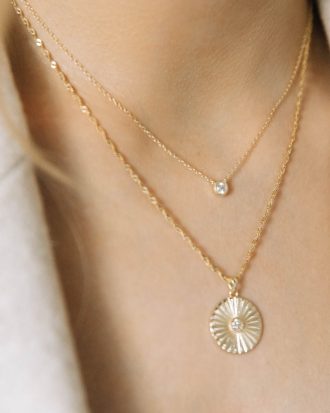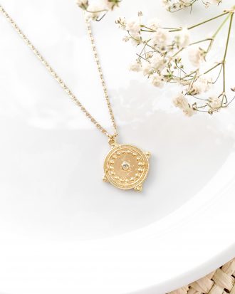 Collar de 55 cm de largo con medalla con circón en el centro, también bañado en oro.